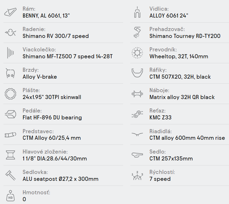 | Pneumatiky: | 24x1.95" 30TPI skinwall |