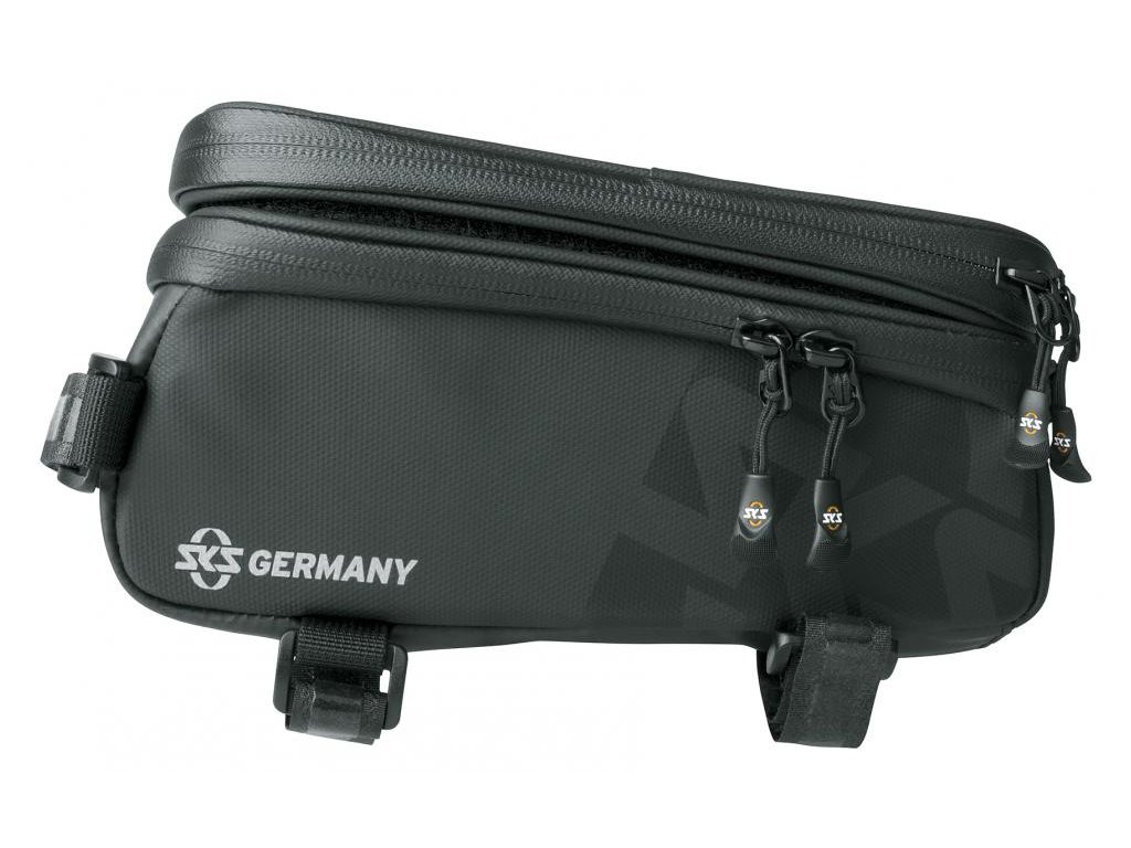Inteligentná rámová cyklo brašna SKS Explorer Smart s oddeliteľným púzdrom na telefón kompatibilným s dotykovými displejmi a integrovaným vreckom na drobnosti. Brašna je vyrobená z pogumovanej vodeodolnej tkaniny. Reflexné prvky na bokoch zaisťujú väčšiu bezpečnosť po zotmení. Brašna sa pripevňuje pomocou odolných pogumovaných suchých zipsov. A nechýba ani výstup na slúchadlá.
